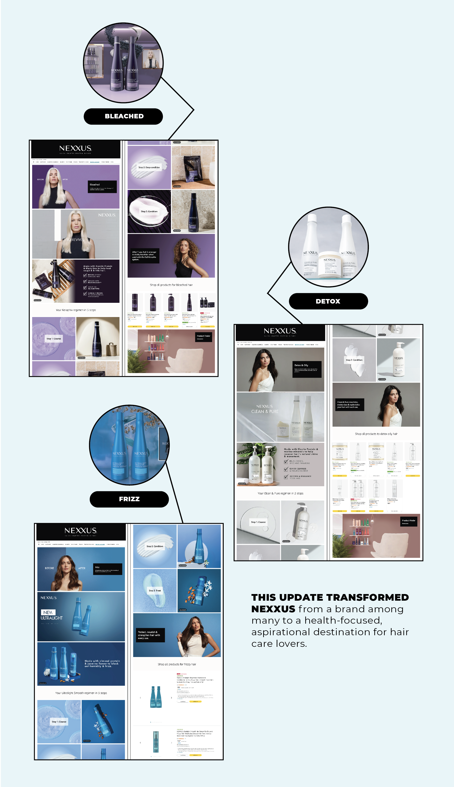 By focusing on sensory appeal and science-backed credibility, we created an immersive brand experience that showcased Nexxus's innovative formulas and benefits. Every page element was designed to captivate—from rich visuals highlighting product texture and results to curated brand stories that resonate with health-conscious beauty seekers.